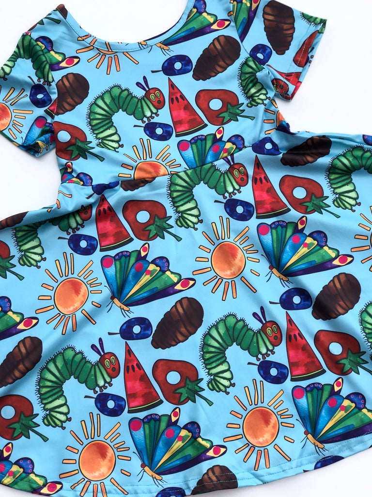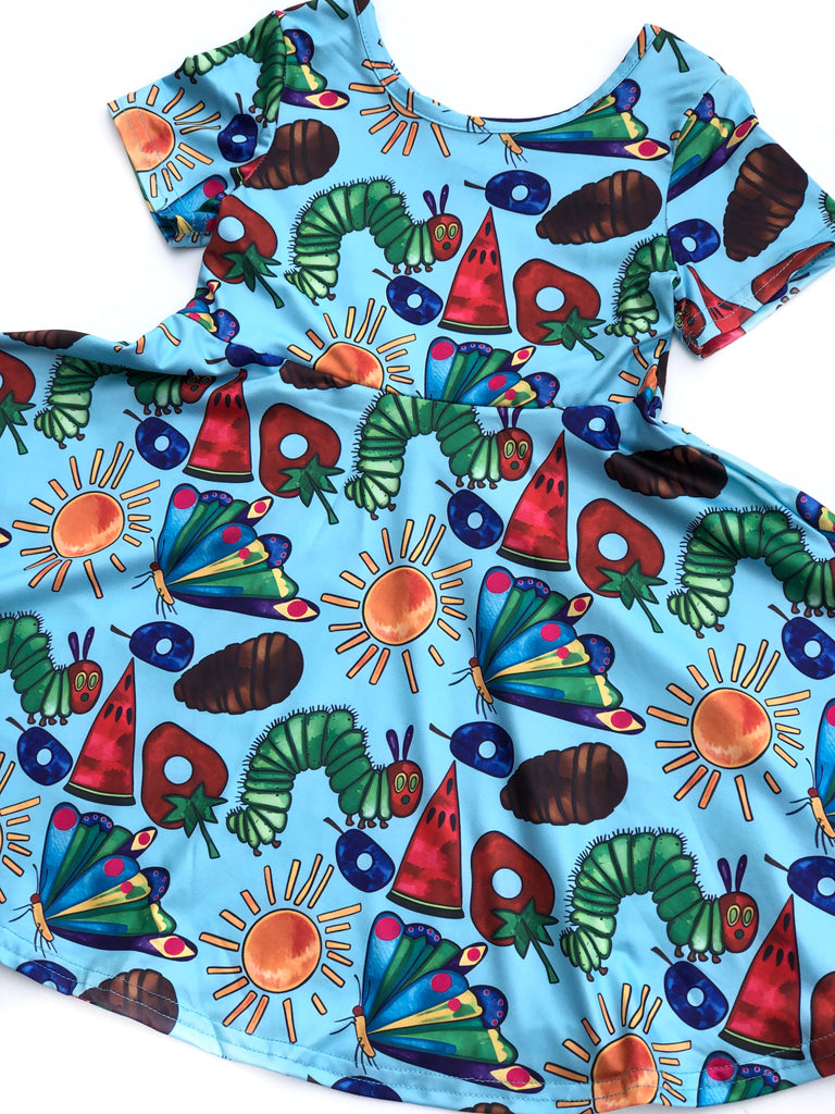 Make the best impression in this fun & vibrant Hungry Caterpillar themed twirl dress. Perfect for portraits, theme parties, library days, educational outings, & everyday wear!  This dress is made from an ultra comfy milk silk material & can easily be layered with a colorful cardigan or zip up. We are offering this as a very limited edition piece. Great for gift giving!
