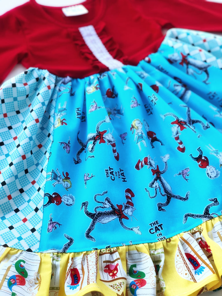 Our Classic Cat Seuss dress is fashioned in our knit long sleeve style bodice & a cotton ruffle skirting, perfect for wowing the crowd! Hand designed from a delightful mix of prints that please & colors that pop. Great for Read Across America, Back to School, Kindergarten graduation, Dr. Seuss days, gift giving, presents, & everyday wear!