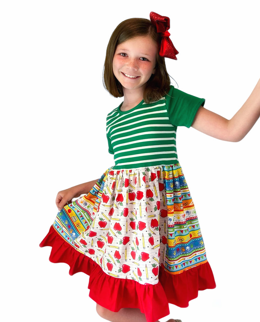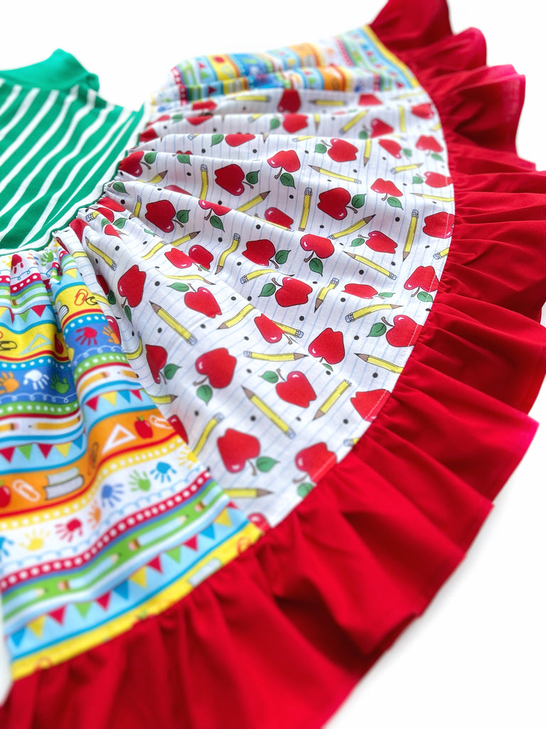 Our Elementary Apple Back to School dress is fashioned in our knit flutter style bodice & a cotton full ruffle skirting, perfect for wowing the crowd! Custom designed from a delightful mix of prints that please & colors that pop. Great for back to school, school events, field trips, & everyday wear!