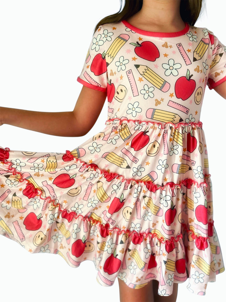 Crafted with meticulous attention to detail, this school themed twirl dress features a whimsical silhouette that effortlessly combines sophistication with playfulness. Soft, flowing fabric cascades gracefully from the waist.