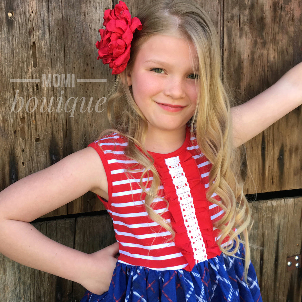 Our Patriotic Prep dress is fashioned in our knit tank style bodice & a cotton full ruffle skirting, perfect for wowing the crowd! It's a fancy/casual dress. Dress this one up, or down, in many different ways. Custom designed from a delightful summer weight, breezy, navy/red/white/Coral plaid Floral cotton fabric! Great for Fourth of July, portraits, beach, back to school, & everyday wear!