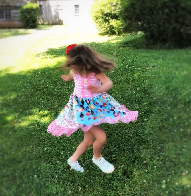 Fashioned in our knit tank style bodice & a cotton ruffle skirting, perfect for wowing the crowd! Hand designed with your adventures in mind! Great for the first day of school pictures, gift giving, & everyday wear!