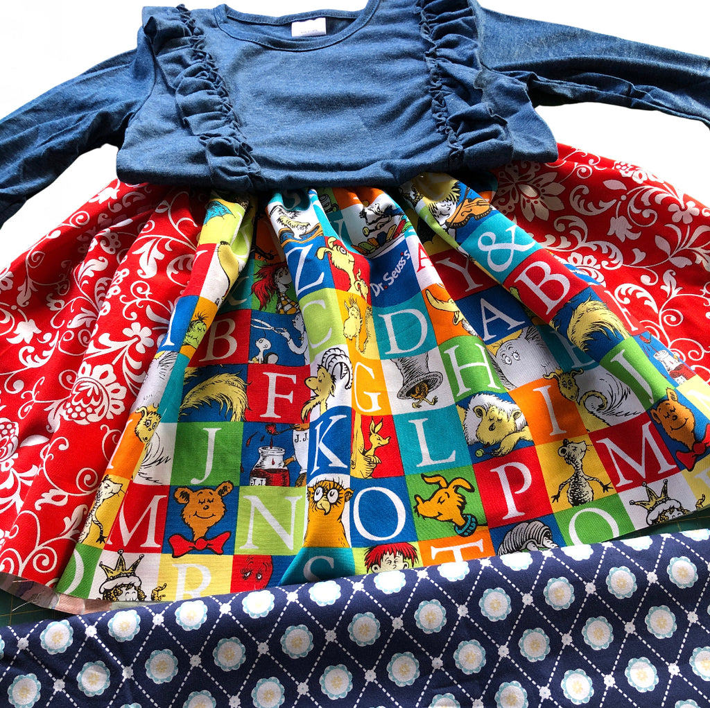 Our Studious Seuss dress is fashioned in our knit flutter style bodice & a cotton ruffle skirting, perfect for wowing the crowd! Hand designed from a delightful mix of prints that please & colors that pop. Great for Read Across America, Back to School, Kindergarten graduation, Dr. Seuss days, gift giving, presents, & everyday wear!
