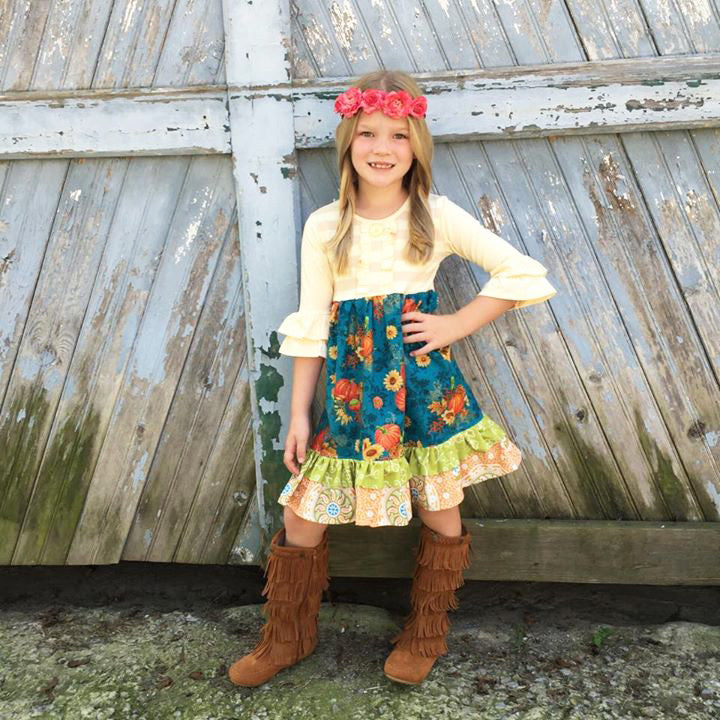 Pumpkin Pie 3/4 sleeve dress Size/length: 12mo: 17" 2: 21" 4: 24" 6: 26" 8: 28" Knit chest width unstretched: sz 12mo/18mo: 20" 2/3: 22.5" 4/5: 23.5" 6/7: 26" 8: 28"
