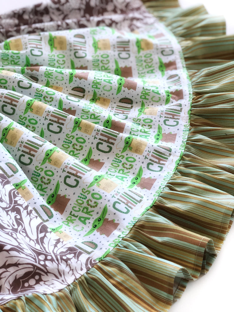 Turn all of the heads in this exclusive Baby Yoda design.  Fashioned in our knit flutter sleeve style bodice & a cotton ruffle skirting, perfect for wowing the crowd! Hand designed from a delightful mix of prints that please & colors that pop. Great for theme parties, birthday parties, gift giving, presents, Spring & summer, layering, & everyday wear!