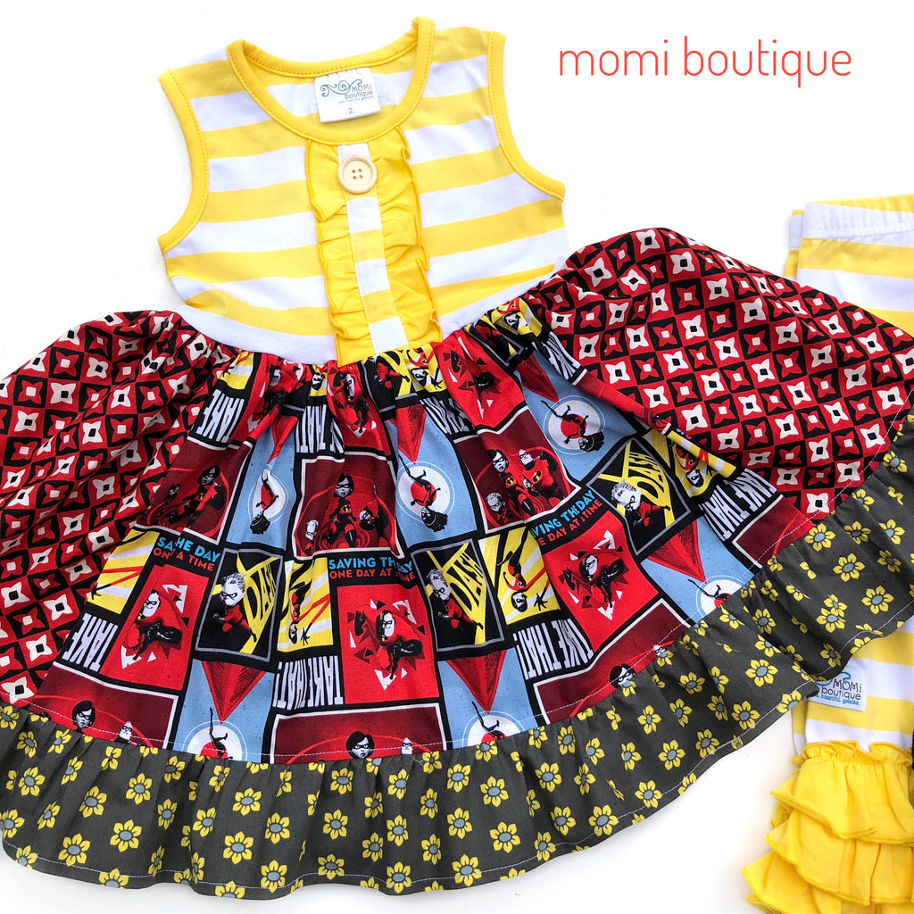 Make her stand out in the crowd in our *NEW* Incredibles dress! Fashioned in our knit yellow/white tank style bodice & a cotton ruffle skirting, perfect for wowing the crowd! Hand designed from a delightful mix of prints that please & colors that pop. Great for Disney vacations, Incredibles birthday parties, movie days, gift giving, & everyday wear!