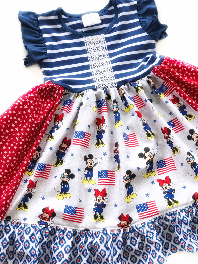 Our Main Street USA dress is fashioned in our knit flutter style bodice & a cotton ruffle skirting, perfect for wowing the crowd! Hand designed from a delightful mix of prints that please & colors that pop. Great for Magical vacations, Disney days, gift giving, theme parties, & everyday wear!