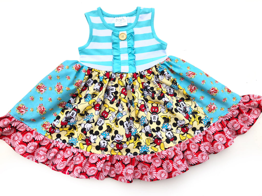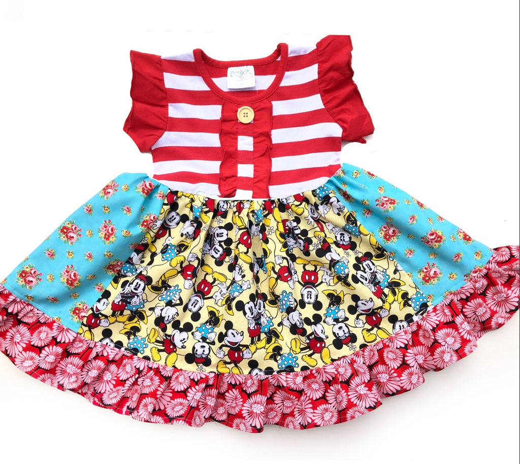 Our Mickey & Minnie on Main Street Disney dress is fashioned in our knit flutter ruffle sleeve style bodice & a cotton ruffle skirting, perfect for wowing the crowd! Hand designed from a delightful mix of prints that please & colors that pop. Great for theme parties, birthday parties, gift giving, Memorial Day, Flag day, Fourth of July, Labor Day, Epcot, Magical vacations, & everyday wear!