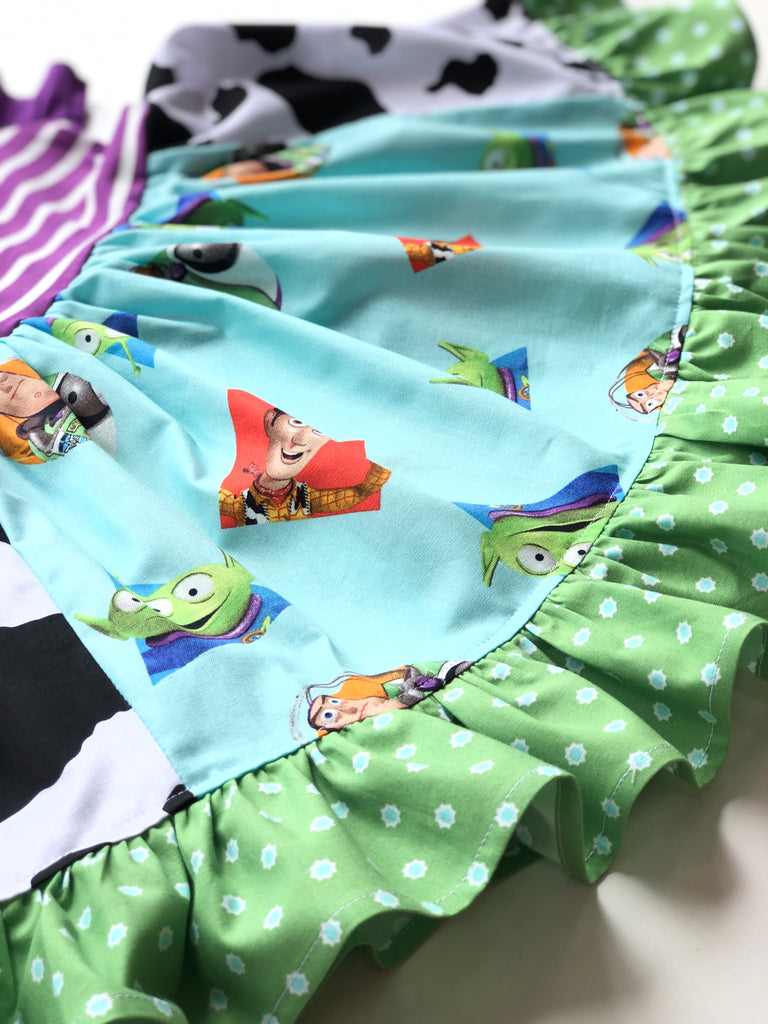 Our Toy Story Reach for the Sky dress is fashioned in our knit purple stripe flutter style bodice & a cotton ruffle skirting, perfect for wowing the crowd! Hand designed from a delightful mix of prints that please & colors that pop. Great for theme parties, birthday parties, gift giving, Toy story events, Disney vacations, & everyday wear!