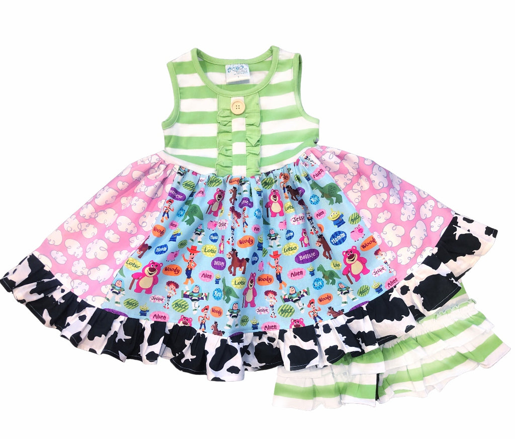 Our Toy story Land dress is fashioned in our knit green/white tank style bodice & a cotton ruffle skirting, perfect for wowing the crowd! Hand designed from a delightful mix of prints that please & colors that pop. Great for Pixar Fest, Disney vacations, Toy Story Land, Toy Story birthday parties, gift giving, & everyday wear!