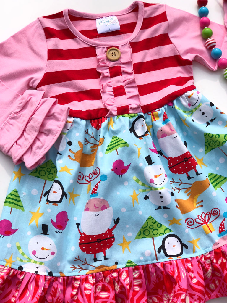 The Winter Wonderland Christmas dress is fashioned in our knit triple ruffle long sleeve style bodice & a cotton ruffle skirting, perfect for wowing the crowd! This is an A line style dress with a single ruffle on the bottom. Due to the large scale nature of the skirting, placement of grinch will not always be identical to the pictured sample. Hand designed from a delightful mix of prints that please & colors that pop. Great for holiday portraits, Christmas parties, gift giving, & everyday wear!