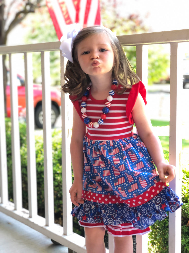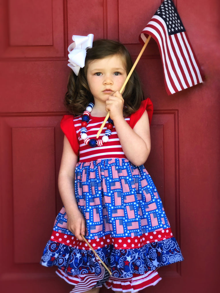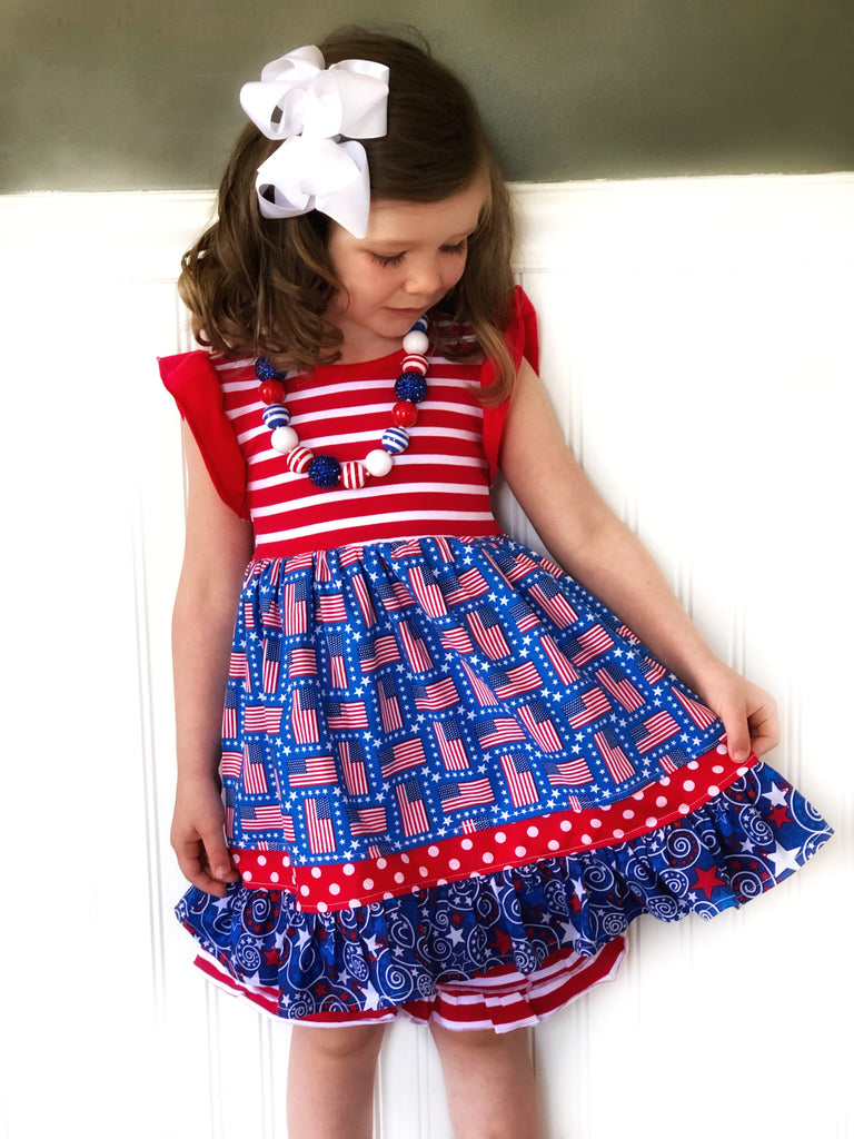 Fashioned in our knit flutter style bodice & a cotton ruffle skirting, perfect for wowing the crowd! Custom designed from a delightful mix of prints that please & colors that pop. Great for a day at A patriotic parade, 4th of July parties, picnics, portraits, military homecomings, & everyday wear!