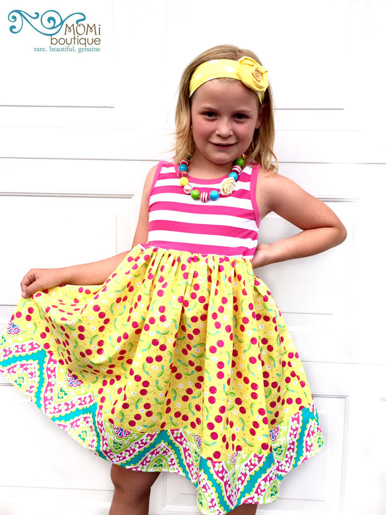 Cheerfully Cherry dress Dress: Size/length: 12mo: 17" 2: 21" 4: 24" 6: 26" 8: 28" Knit chest width unstretched: sz 12mo: 20" 2: 22.5" 4: 23.5" 6: 25" 8: 27"