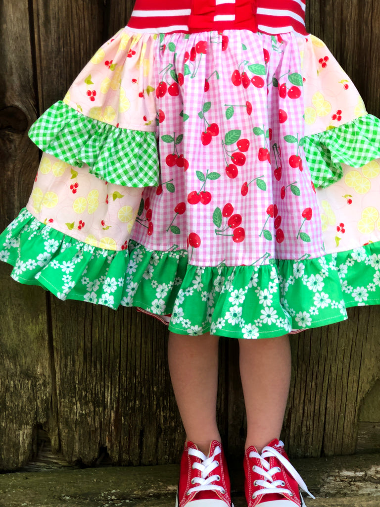 Our Cherry Lemonade Platinum Party style dress is fashioned in our knit tank style bodice & a cotton full ruffle skirting, perfect for wowing the crowd! Custom designed from a delightful mix of prints that please & colors that pop. Great for portraits, picnics, bake shop outings, cherry festivals, birthday parties, portraits, & everyday wear!