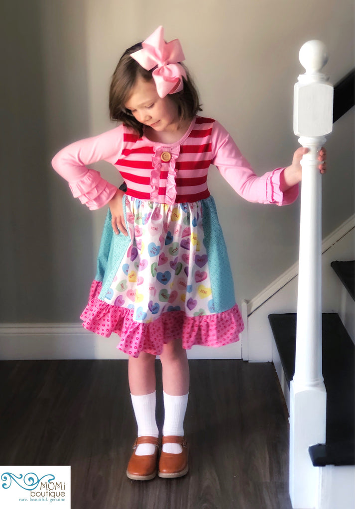 Our Conversation Heart dress will set her apart from the rest! This style dress is fashioned in a triple ruffle pink/red long sleeve knit bodice w/ lace & a cotton full ruffle skirting, perfect for wowing the crowd! Custom designed from a delightful mix of prints that please & colors that pop. Great for Valentineās Day, portraits, school events, parties, & everyday wear!