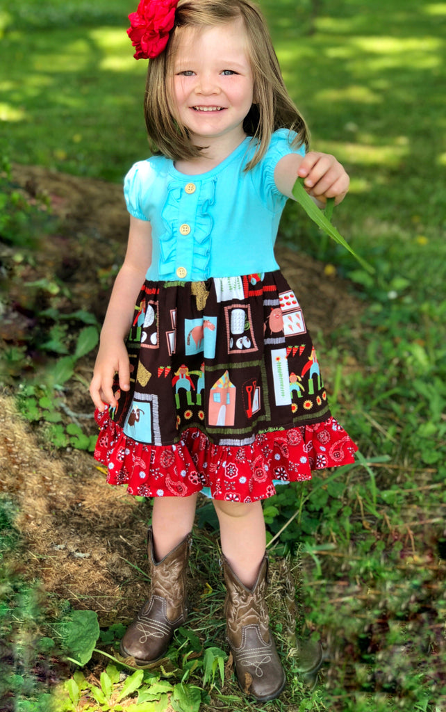 Our Down on the farm is fashioned in our blue knit puff short sleeve style bodice & a cotton full skirting, perfect for wowing the crowd! Hand designed from a delightful mix of prints that please & colors that pop. All designs are tagged in the even size.Β