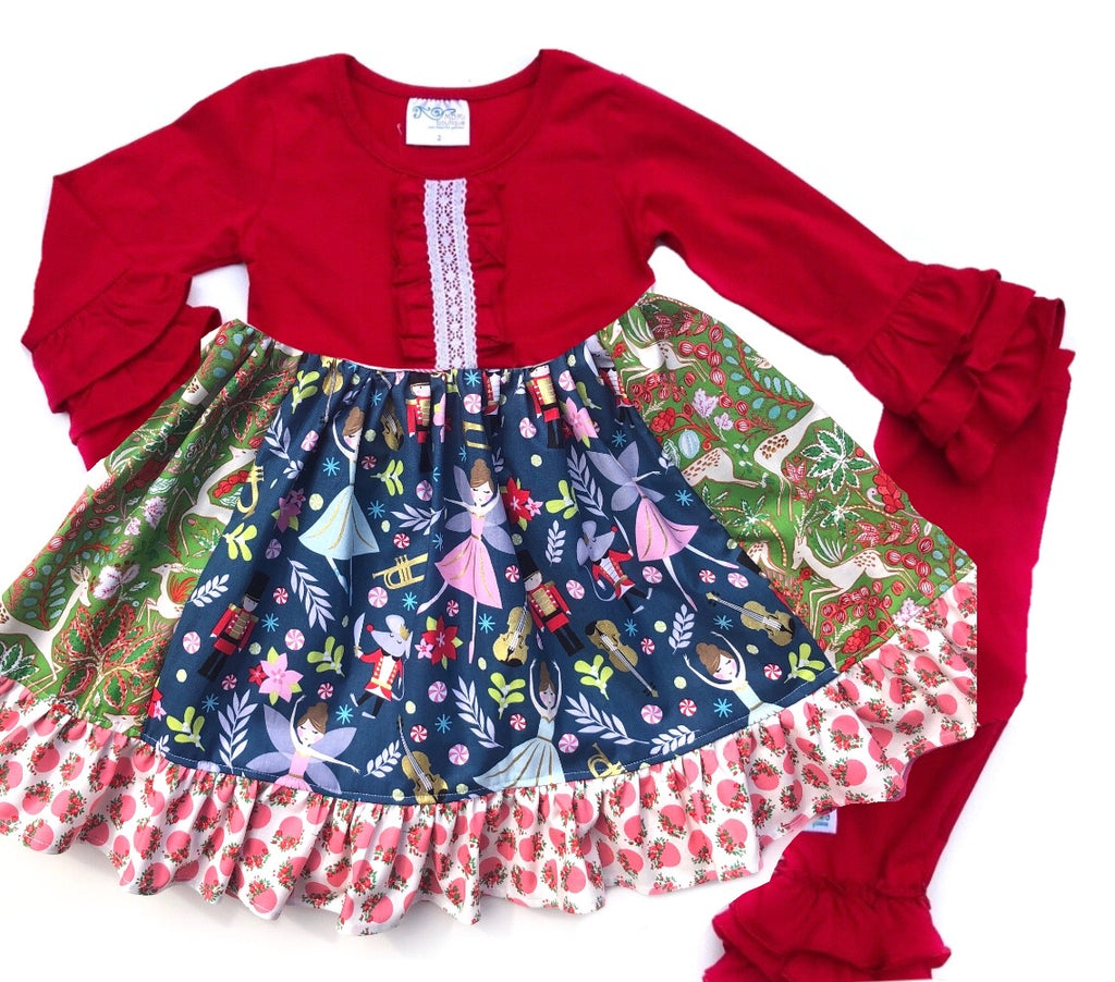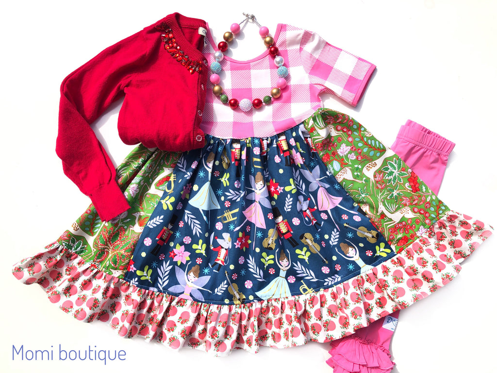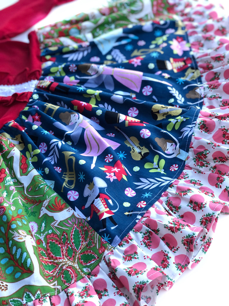 Set her apart from the rest! Our Enchanted Nutcracker dress is fashioned in our knit Buffalo plaid 2/3 style bodice & a cotton full ruffle skirting, perfect for wowing the crowd! Custom designed from a delightful mix of prints that please & soft colors that command compliments! Great for Christmas portraits, holiday parties, concerts, the Nutcracker ballet, & everyday wear!