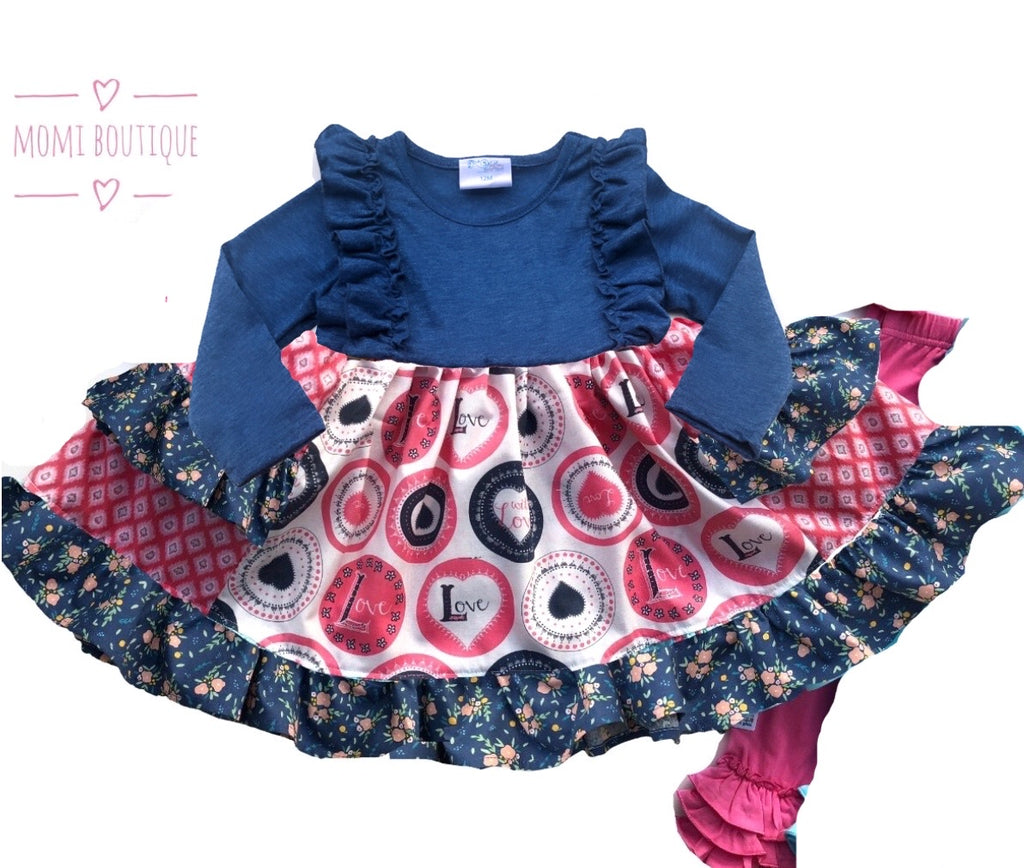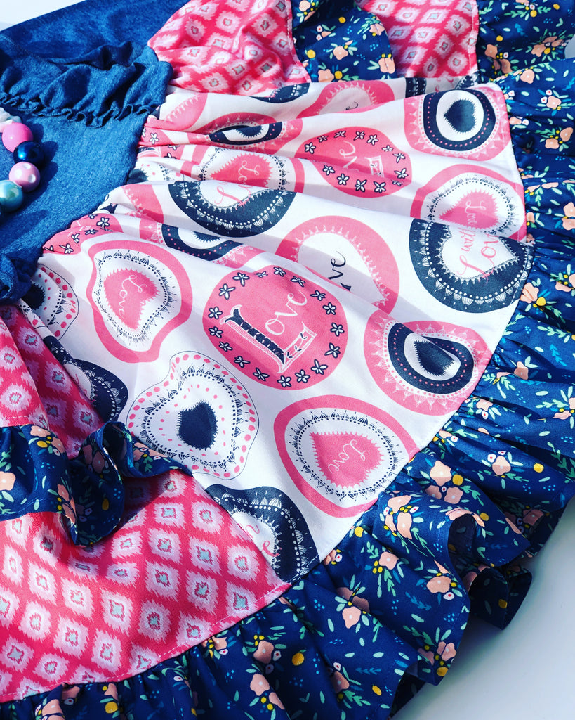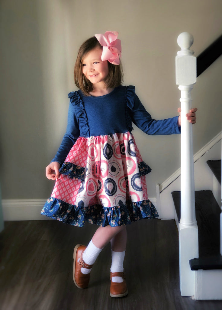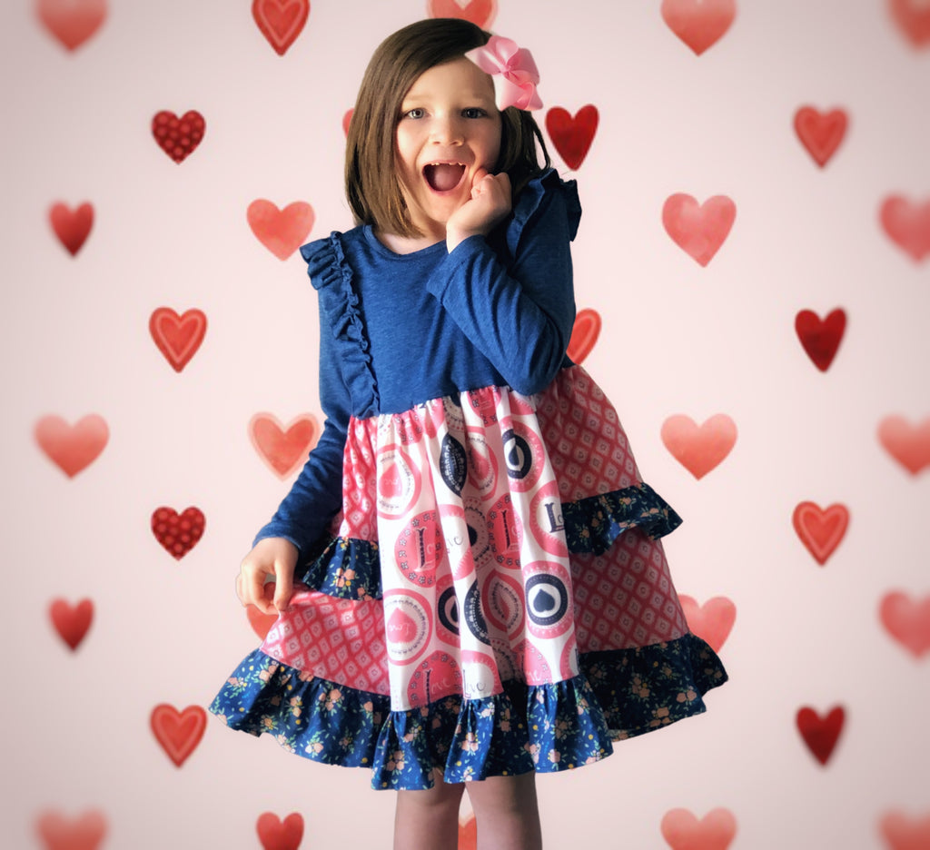 She will be loved Platinum Party style dress is fashioned in a triple ruffle pink long sleeve knit bodice w/ lace & a cotton full ruffle skirting, perfect for wowing the crowd! Custom designed from a delightful mix of prints that please & colors that pop. Great for Valentineās Day, portraits, school events, parties, & everyday wear!