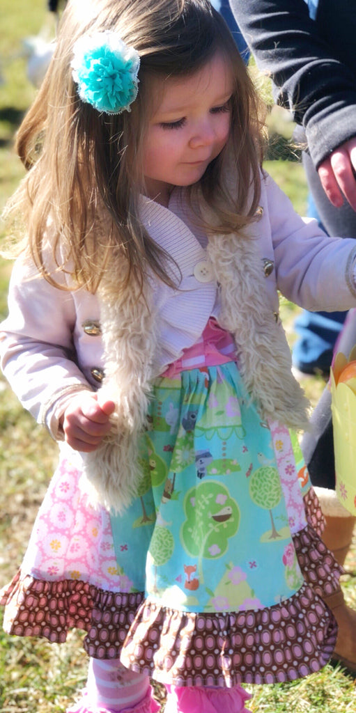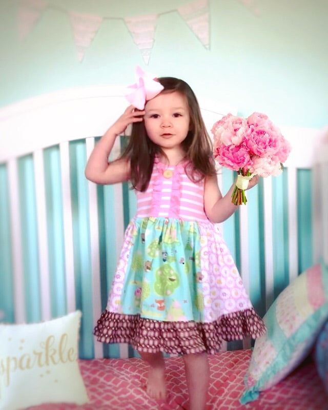 Our Springtime Pastel Forest dress is the perfect dress to slip on & go. Go to the zoo, go to baby showers, bridal showers, church, story time at the library, & endless wearing possibilities. This comfy & unique, over the head, style dress is fashioned in our knit tank style bodice & a cotton full ruffle skirting, perfect for wowing the crowd! Custom designed from a delightful mix of prints that please & colors that. Great for theme birthday parties, portraits, gift giving, & everyday wear!
