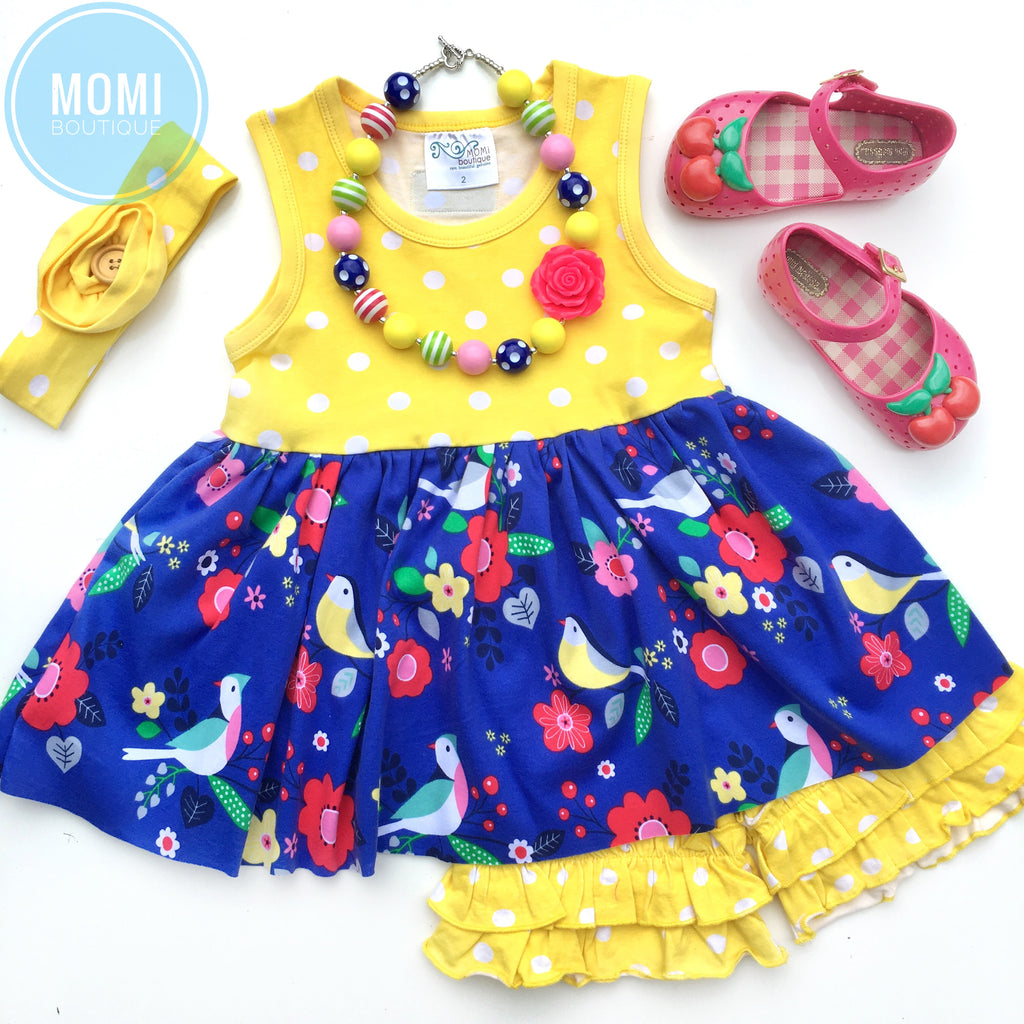 Summer Songbird  features polka dots, flowers, & colorful birds.  Fashioned in our knit tank style dot bodice & a knit songbird skirting, perfect for wowing the crowd! Custom designed from a delightful mix of prints that please & colors that pop. Great for birthday parties, portraits, picnics, & for everyday wear!