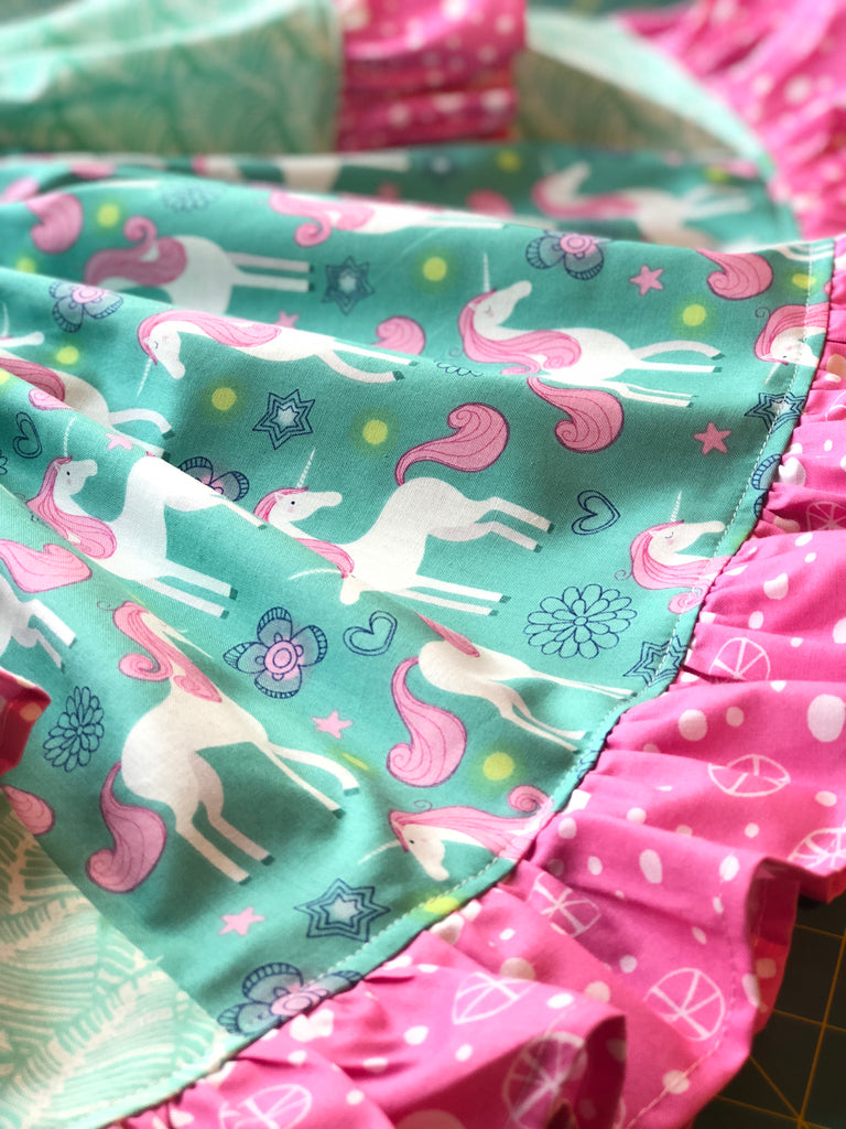Our Unicorn Platinum Party style dress is fashioned in our knit style bodice & a cotton full ruffle skirting, perfect for wowing the crowd! Custom designed from a delightful mix of prints that please & colors that pop. Great for Unicorn birthday parties, portraits, & everyday wear!