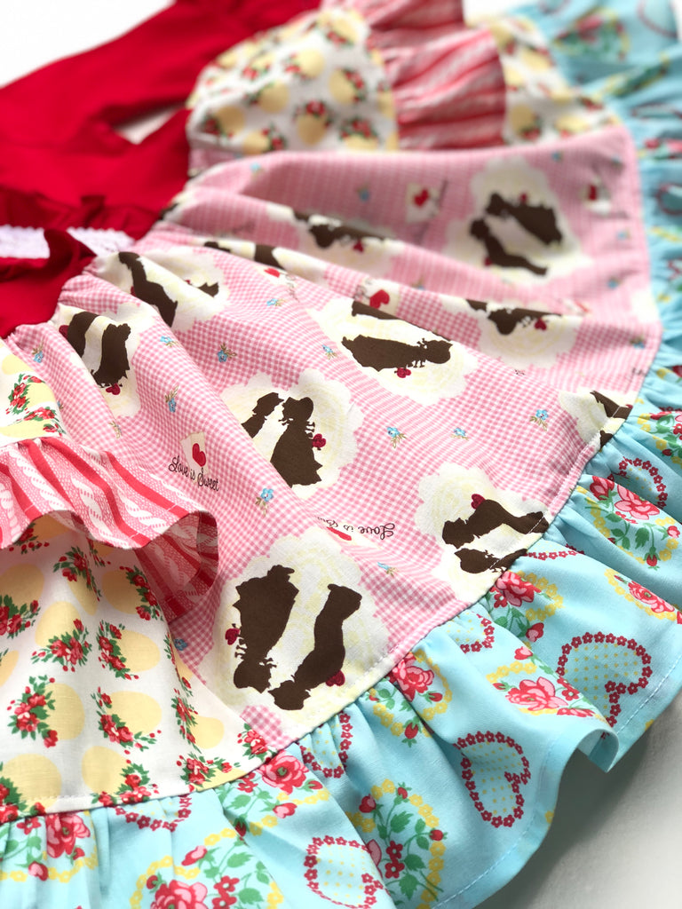 Set her apart from the rest this Valentine’s Day in our Vintage Valentine Platinum Party style dress is fashioned in a triple ruffle red long sleeve knit bodice w/ lace & a cotton full ruffle skirting, perfect for wowing the crowd! Custom designed from a delightful mix of prints that please & colors that pop. Great for Valentine’s Day, portraits, school events, parties, & everyday wear!