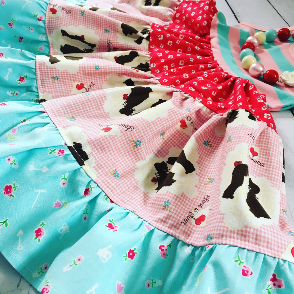 Our Vintage Valentine dress is fashioned in our knit tank style bodice & a cotton ruffle skirting, perfect for wowing the crowd! Perfect for layering with a long sleeve underneath or a cute cardigan & cowboy boots! Hand designed from a delightful mix of prints that please & colors that pop. Great for theme parties, Valentine's Day, Valentine parties, gift giving, presents, & everyday wear! All designs are tagged in the even size. 12mo/18mo: 17" 2/3: 21" 4/5: 24" 6/7: 26" 8" 28" Chest width unstretched: sz 12mo/18mo: 20" 2/3: 22.5" 4/5: 23.5" 6/7: 26" 8: 28" *This listing is for the dress only! Outfit options can be found in the drop down menu! Outfit = Dress, double ruffle pink/aqua shorts, & necklace! Ships in 2-3 days!